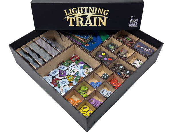 Unofficial, custom-designed laser cut MDF organizer insert for Lightning Train, designed to store all your pieces and simplify setup in the original game box. Comprised of 12 pieces when fully assembled, this organizer helps you stay organized, save time, and play more.